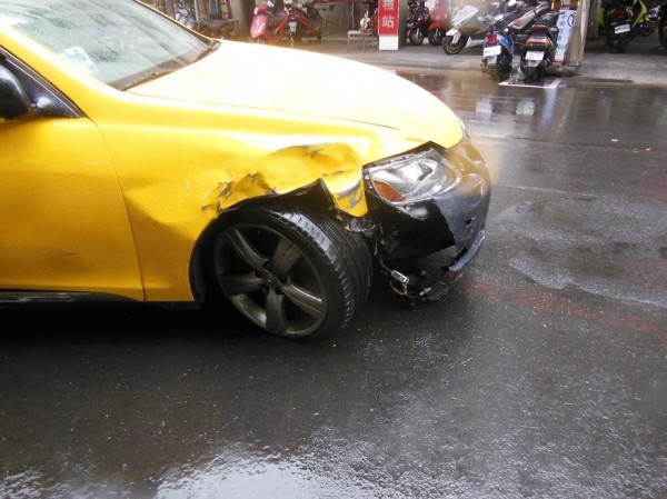 詹男駕駛的計程車右車頭撞擊受損。(記者余衡翻攝)
