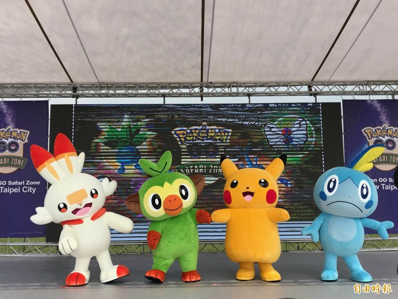 活動現場有寶可夢炎兔兒(左)、敲音猴(左2)、淚眼蜥(右)表演,炒熱整場氣氛。(記者簡亭宇攝)