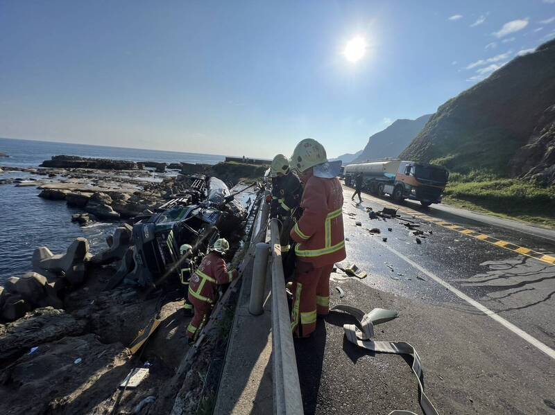 46歲李姓司機今日上午7時許,載運氯化鈣行經台2線濱海公路79.5公里處往基隆方向時,疑似突然恍神,不慎衝路旁護欄衝落邊坡翻覆,受困車內。消防局獲報後,派員前往現場,將李男救出,但已無生命跡象。經送醫搶救後,8時25分宣告不治身亡。警方目前已調閱行車紀錄器及周邊監視器,釐清李男肇事原因。