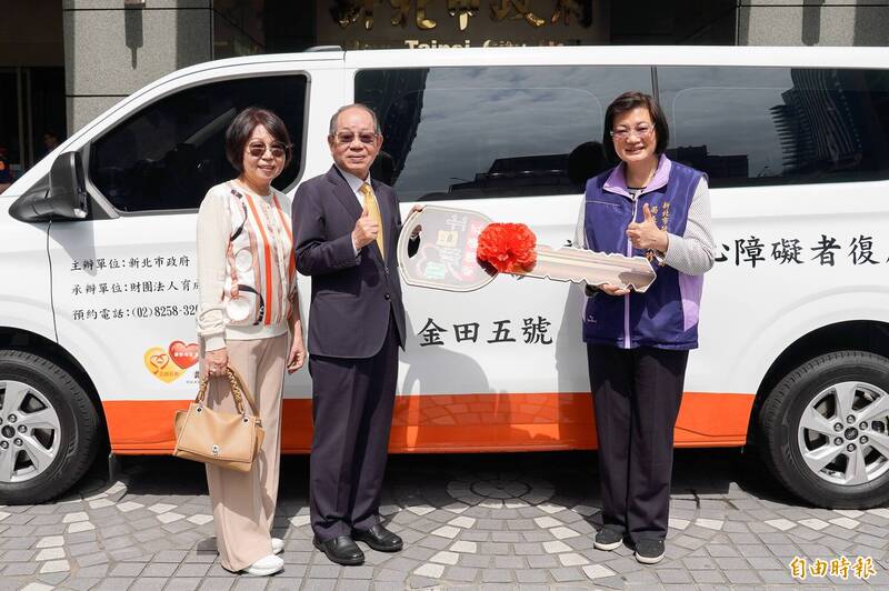 前新北市議會秘書長林新欽(中)偕妹妹林玫宏(左)捐贈復康巴士,社會局長李美珍(右)代表受贈。(記者翁聿煌攝)