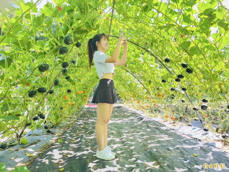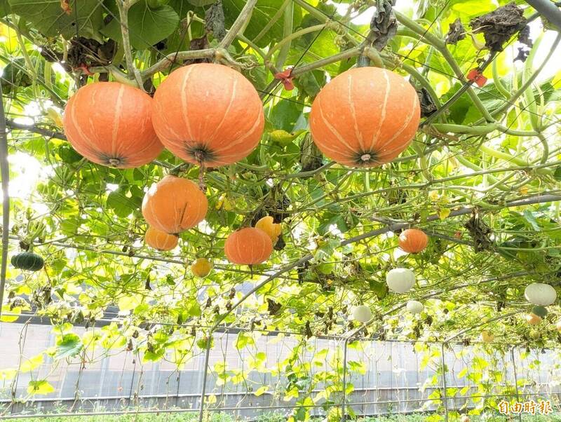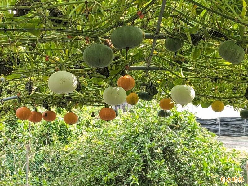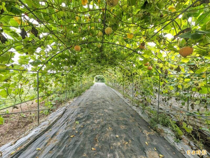 農友「屯山阿嬤」謝簡素透過棚架式栽培出色彩繽紛的栗子南瓜,並將棚架打造成9座「南瓜隧道」。(記者黃子暘攝)