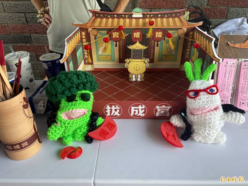 新北新店罷免藍委羅明才公民團體發起首波「拔成宮」活動,邀請民眾擲筊、抽籤詩,並由吉祥物「玄女波波」與「廟公波波」解籤。(記者陳奕劭攝)