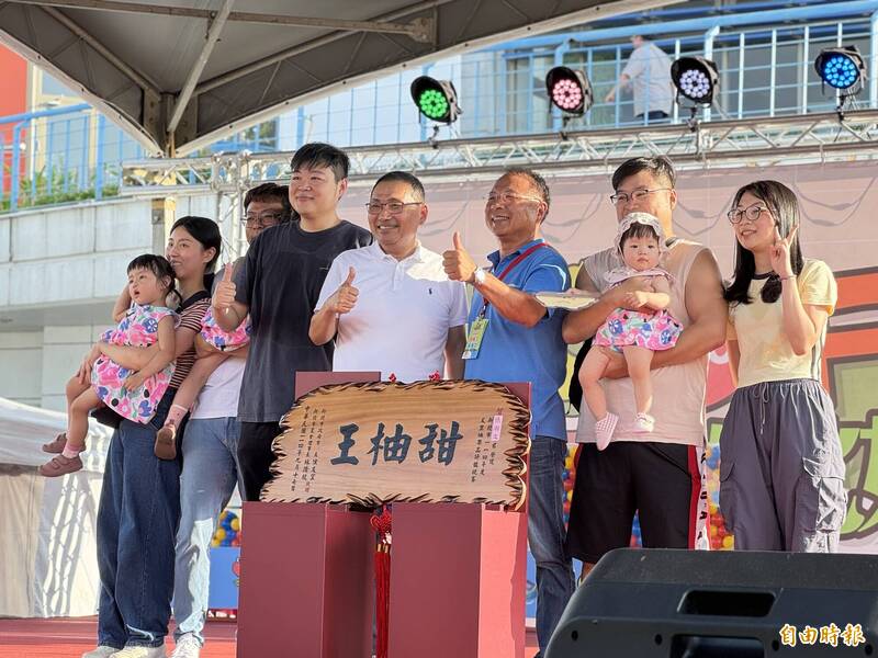 新北市長侯友宜(中)頒甜柚王匾額給獲獎的農友張瀚文(左3)。(記者羅國嘉攝)