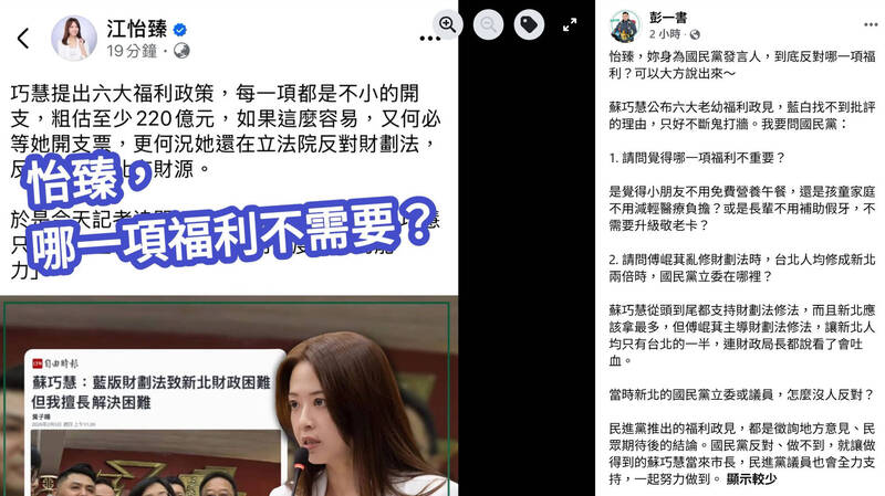 民進黨籍新北市議員彭一書說,國民黨是覺得蘇巧慧公布的大老幼福利政見,哪項福利不重要?他強調,蘇巧慧從頭到尾都支持「財劃法」修法,而且新北應該拿最多,但傅崐萁主導「財劃法」修法,讓新北人均只有台北的一半,當時新北的國民黨立委或議員,怎麼沒人反對?