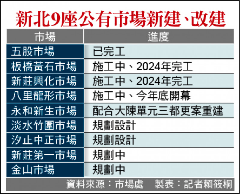 市場處表示,為營造優質的消費採買環境,市府二○一九年起推動公有市場新建、改建與改造計畫,至今已完成十座市場改造,並啟動九座市場新建、改建;已動工的市場將陸續完工,例如八里龍形市場預計今年底開幕,板橋黃石市場預計明年開幕,盼提供民眾舒適的購物空間。