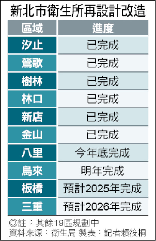 林惠萍說,包括汐止、鶯歌、樹林、新店、金山、林口等六區的衛生所,皆已陸續完成「再設計」,營造嶄新舒適的空間,今年將繼續再完成八里區,明年推進至烏來;此外,板橋衛生所將遷移,最快在二○二五年進駐新的據點,三重衛生所將搬遷至新北第二行政中心,預計二○二六年啟用,其餘的衛生所陸續規劃中。