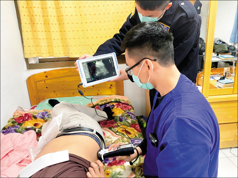 烏來區衛生所主任温傑使用智能行動超音波設備,提供到宅醫療服務。(衛生局提供)
