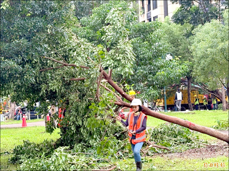 公園倒塌樹木多,清潔隊員忙著移除。(記者陳奕劭攝)