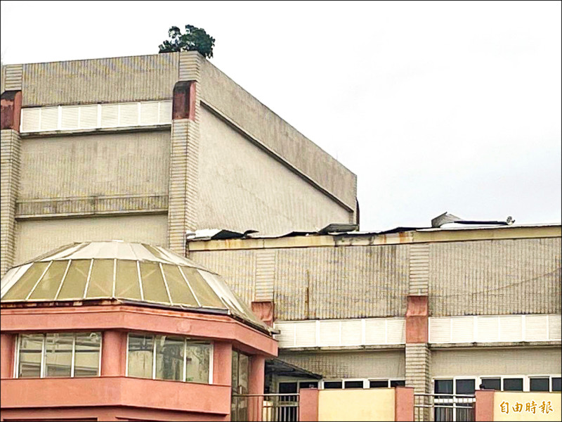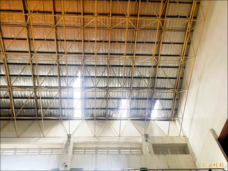 新北市三峽區市立明德中學體健館被強風吹出裂痕,屋頂出現破洞,碎片可能隨時掉落。 (記者陳奕劭攝)