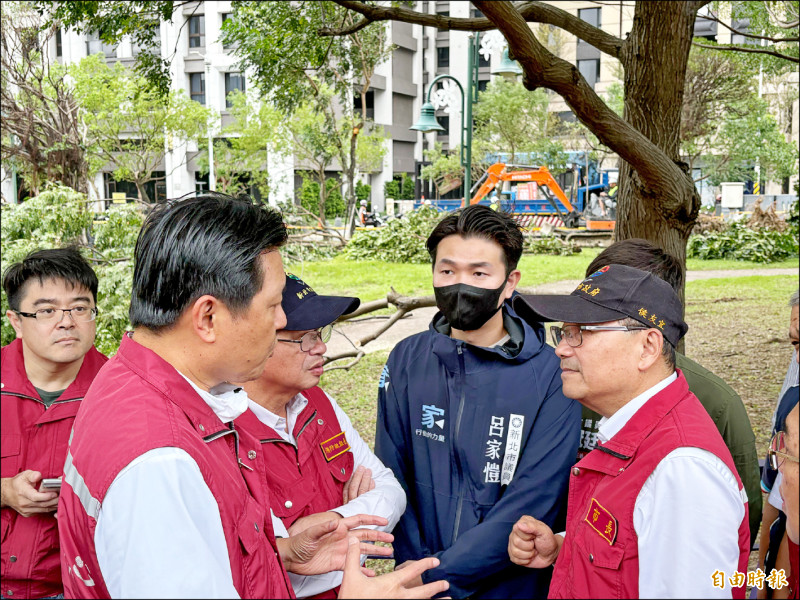 新北市長侯友宜(右一)指示市政府協助社區移除有危險之虞的樹木,解決安全隱患。 (記者陳奕劭攝)