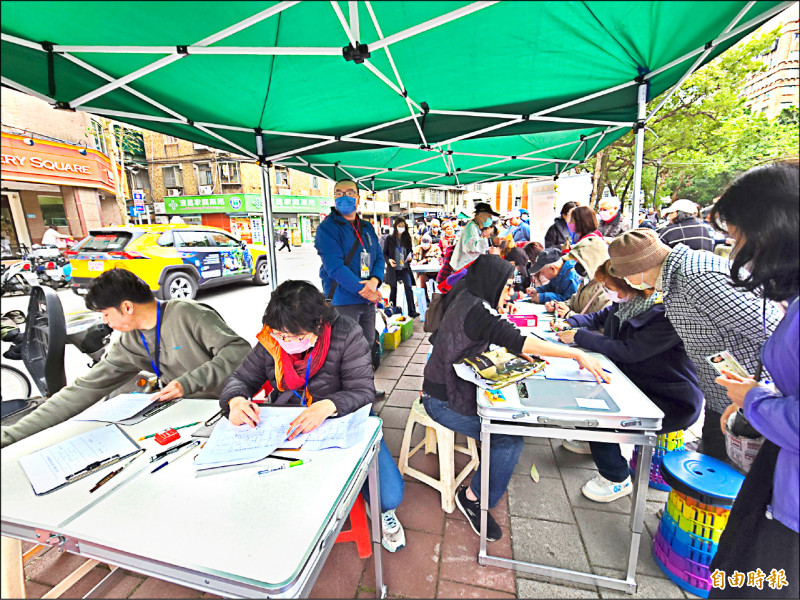 雙和罷免團隊日前設置連署站,有志工協助民眾填寫資料。(記者賴筱桐攝)