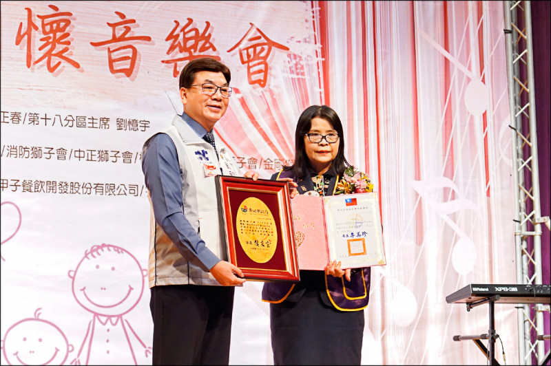 新北市副市長劉和然(左)致贈感謝狀給國際獅子會三〇〇A三區總監張秀芳(右)。(新北市社會局提供)