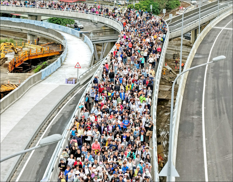 新北市政府昨舉辦「新北市淡江大橋健行活動」,吸引十萬多民眾熱情參與。(新北市民政局提供)