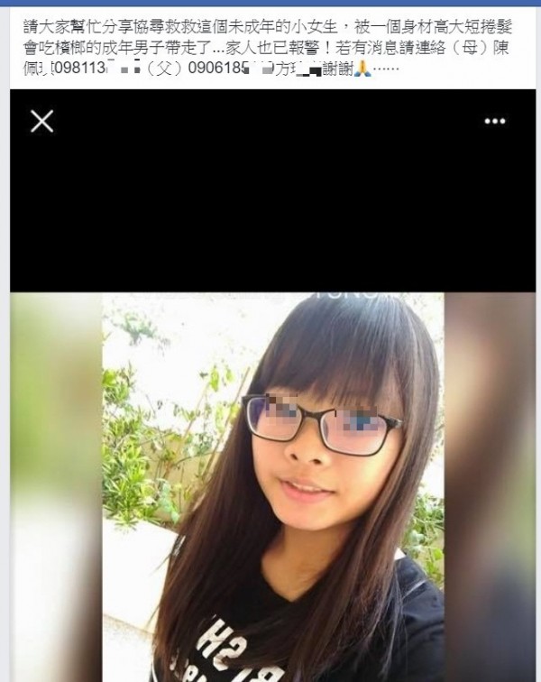 16歲女學生疑遭男網友拐跑失聯 親友急PO網求援