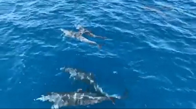 交通輪翔信輪今天中午時分的航班於航行途中再度記錄到海豚出沒,只見至少8隻海豚成群結隊在船艙悠游,配著藍天白雲,影片清楚的記錄到海豚在海中翻身且快速的競游,湛藍大海更讓灰銀色的身軀特別顯眼,乘客見狀直呼相當療癒。