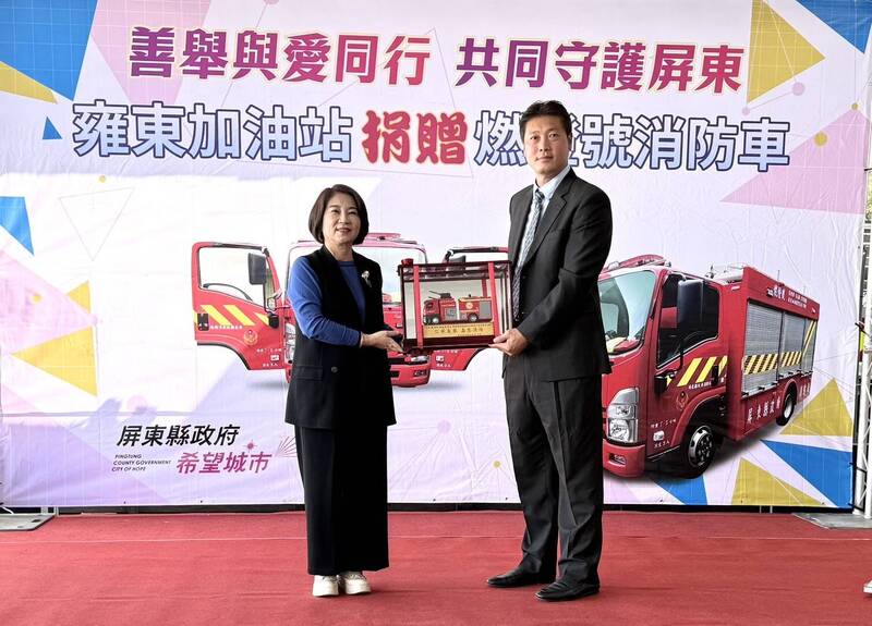 雍東加油站捐贈燃燈號消防車。(屏東縣政府提供)