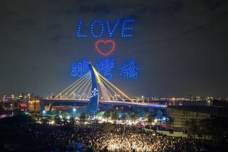 大鵬灣去年鵬灣大橋的無人機表演及煙火,是單日吸引上萬人湧入。(鵬管處提供)