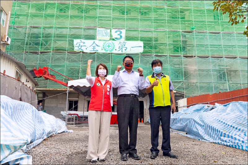 民進黨屏東縣長參選人周春米(左起)積極為屏南地區爭取醫療資源,與縣長潘孟安、恆春鎮長陳文弘參加恆春旅遊醫院重建醫療大樓上梁典禮。(周春米辦公室提供)