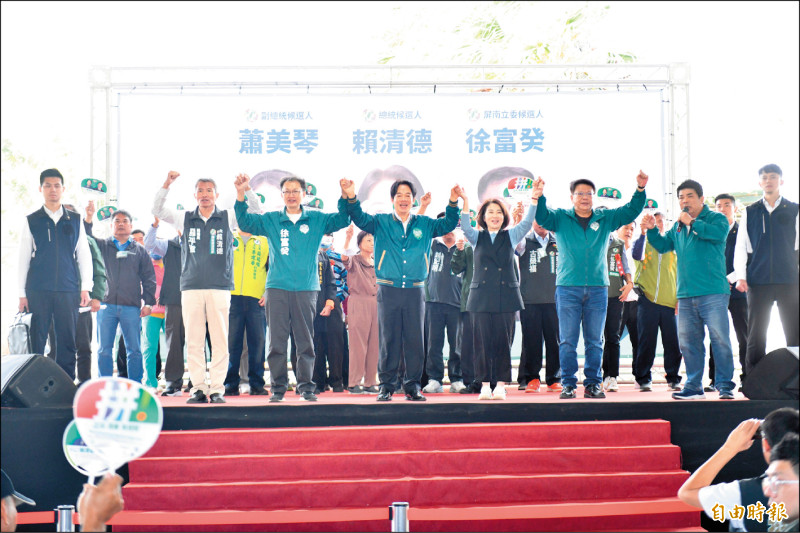 民進黨總統參選人賴清德(前中)五度南下屏南挺徐富癸(前左二),並宣誓要「觀光立國」。(記者蔡宗憲攝)