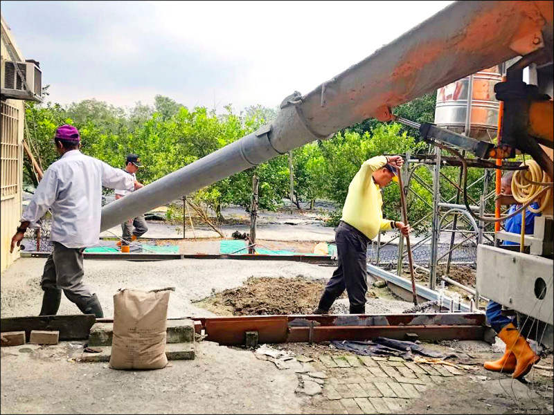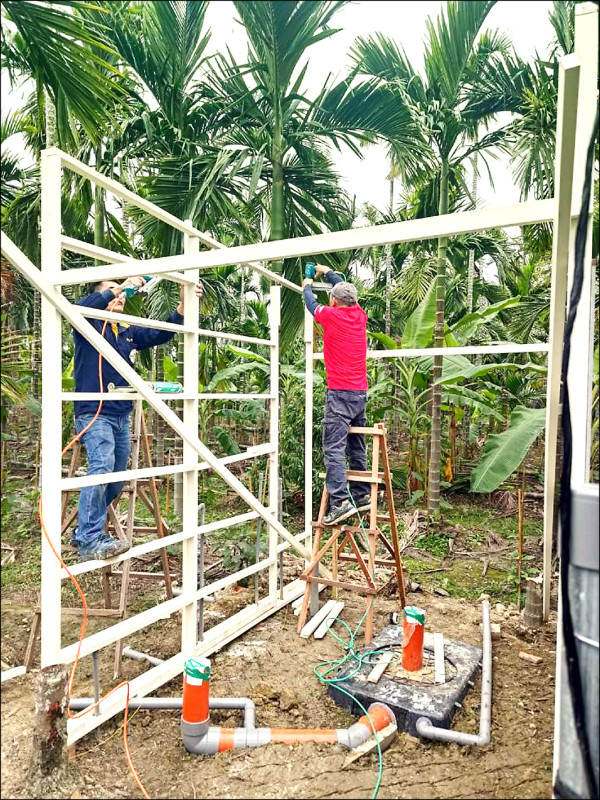 屏縣百工師傅們為萬巒鄉弱勢戶搭建浴廁的施工情形。(屏東縣府提供)