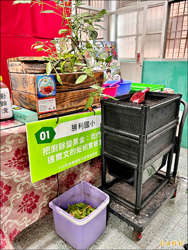 屏東縣勝利國小高年級四位學生組成團隊,從處理學校落葉入手,飼養堆肥蚯蚓,進而用來處理學校廚房的生廚餘,更融入咖啡渣,利用有機廢棄物開發出「蚓菜共生行動車」,既能分解廚餘又可種菜,在今年全國學校環境教育實作競賽中獲國小組第二名。
