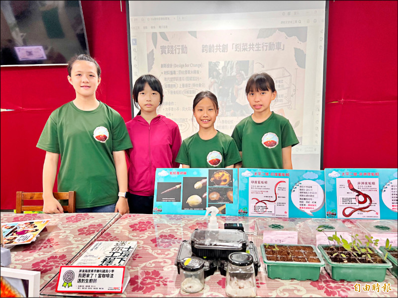 屏東縣勝利國小學生陳苡緁(左起)、吳喬容、陳冠勳、陳紅璇組隊開發出「蚓菜共生行動車」,獲得今年全國學校環境教育實作競賽國小組第二名。(記者羅欣貞攝)