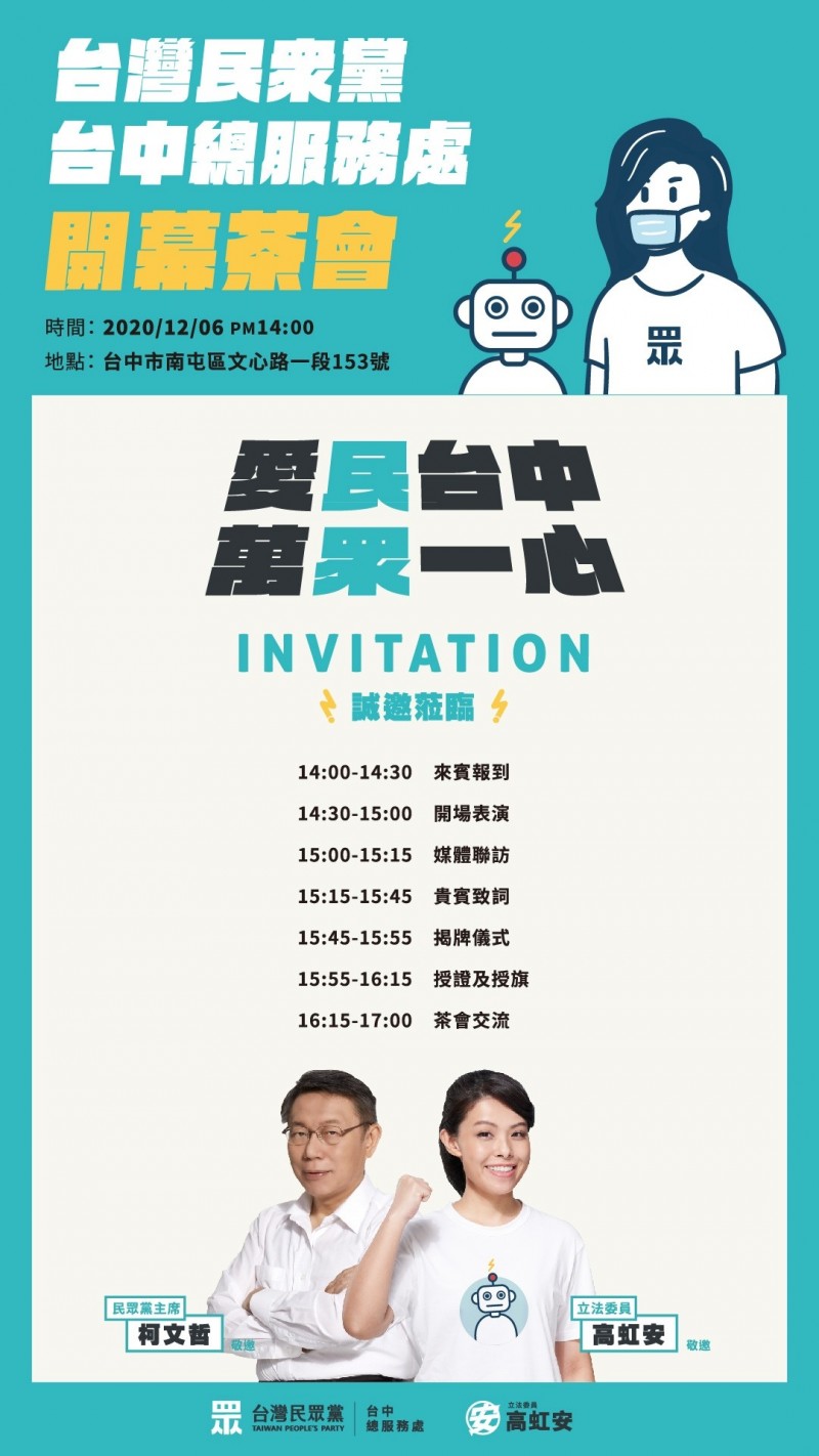 民眾黨將在下月6日到台中設立中部總服務處,最近請帖出爐,由民眾黨主席柯文哲及立委高虹安雙掛名邀請,高虹安不諱言這個總部未來也會負責中部的選務,目前已確定中市議員會提名5席以上,至於市長的部份,則要由黨中央決定。