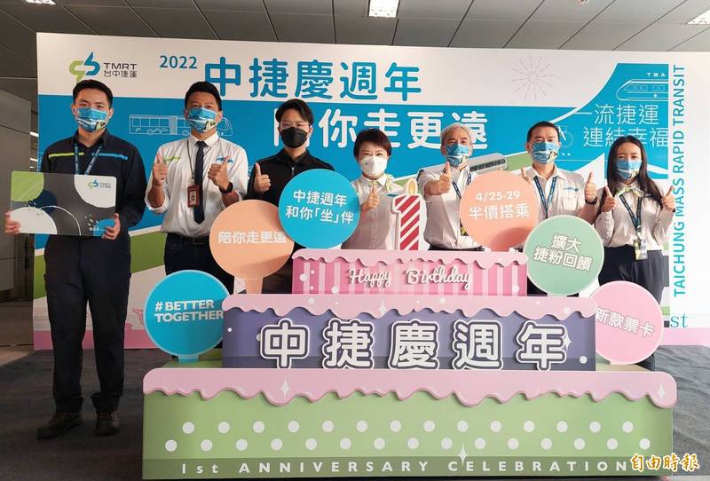 市長盧秀燕、交通局長葉昭甫、中捷公司董事長林志盈、總經理莊明聰、市議員羅廷瑋等人將寫著回饋內容的手拿牌插入蛋糕,象徵許願,期許「中捷慶週年,陪你走更遠」、「未來要更好」、「Better together」。