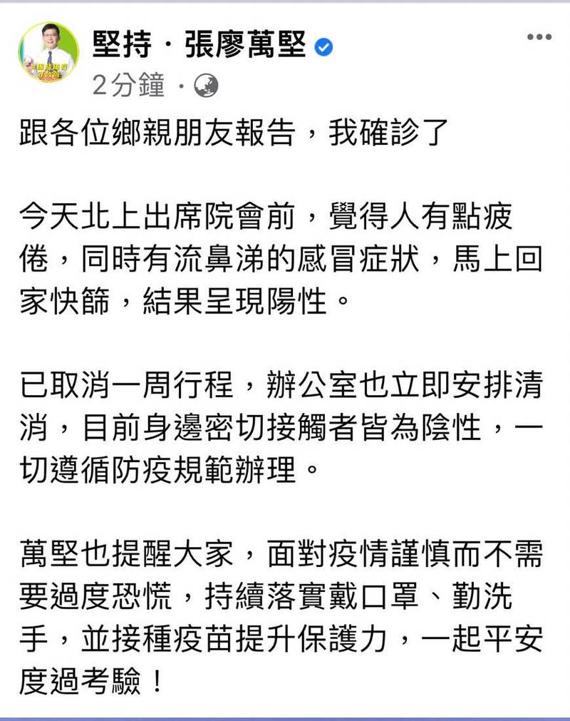 立委張廖萬堅稍早透過臉書表示確診了。(擷自張廖萬堅臉書)