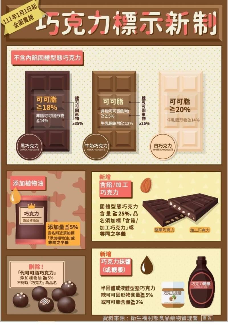 食安處表示,選購巧克力應注意產品外包裝標示是否符合我國「巧克力品名及標示規定」,例如以「巧克力」為品名標示的產品,原料應以「黑巧克力」、「白巧克力」及「牛奶巧克力」為限;品名為「黑巧克力」的產品,應以可可脂混合可可粉、可可膏為原料,且總可可固形物含量至少35%、可可脂至少80%、非脂可可固形物至少40%。