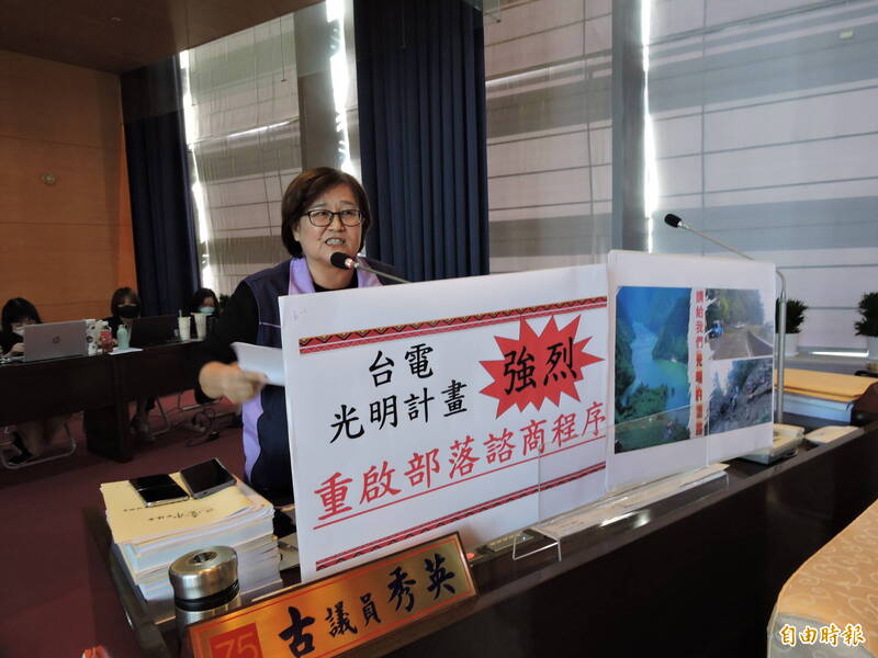 市議員古秀英指台電的光明計畫將破壞大梨山生態,要求重啟部落諮商程序。(記者蘇金鳳攝)