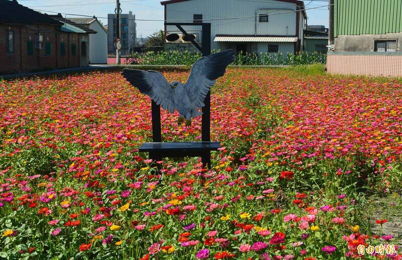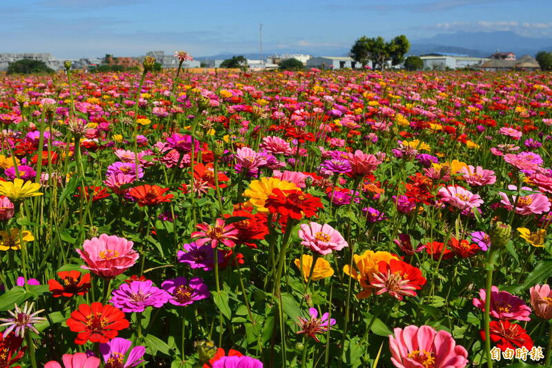 台中霧峰五福社區休耕農田撒下百日草種子,近日開出五顏六色的花海相當漂亮。(記者陳建志攝)
