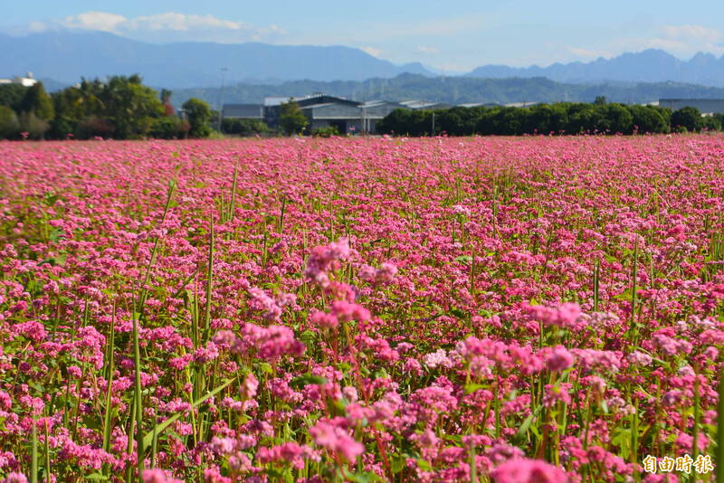 台中霧峰五福社區休耕農田撒下蕎麥種子,近日一大片粉紅色的花朵隨風搖曳,彷彿粉紅色的花海。(記者陳建志攝)