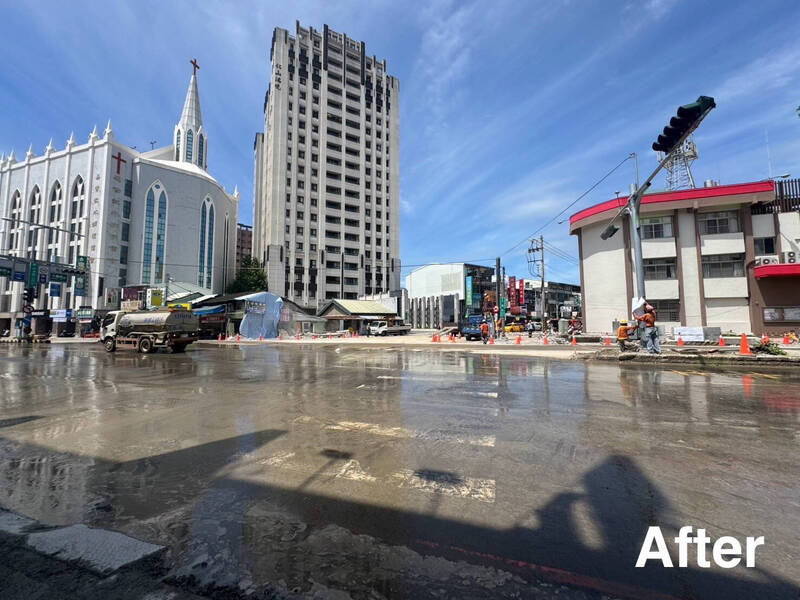 水湳天橋拆除後進行路面清洗,今天上午開放通車。(市府提供)