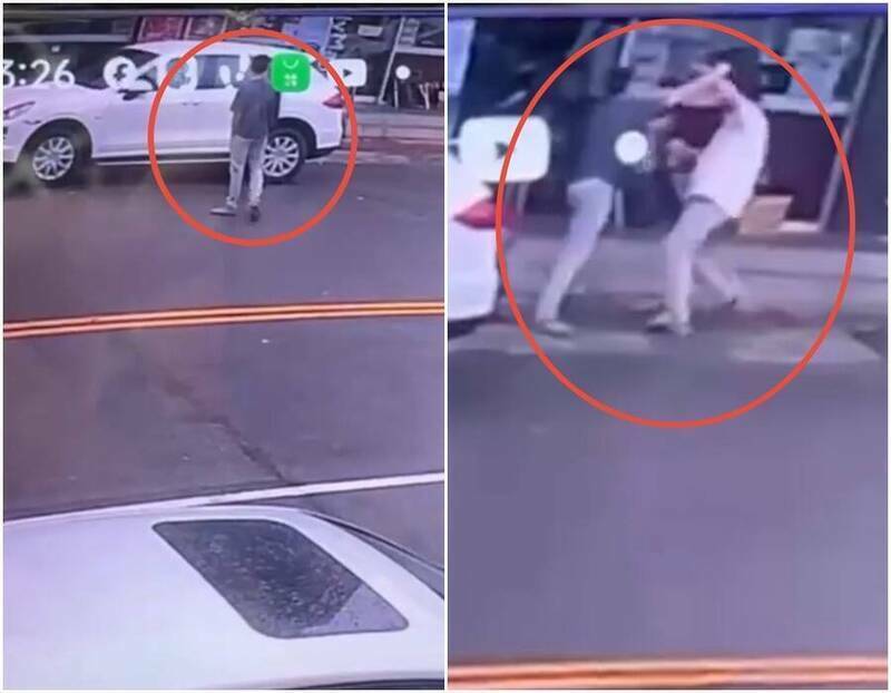 黃相元埋伏於超商外(左圖),伺機攻擊詹智能(右圖,白衣者),致命傷是左小腿膕窩(膝窩)的刀傷。(民眾提供)
