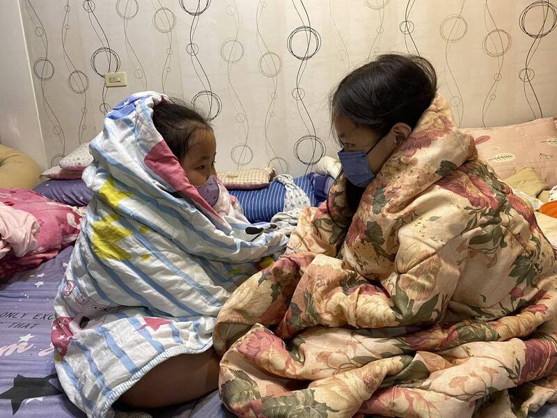小婷跟妹妹在寒流來襲時只能靠多裹幾層棉被禦寒,希望能有一台電暖器讓全家取暖。(南台中家扶提供)