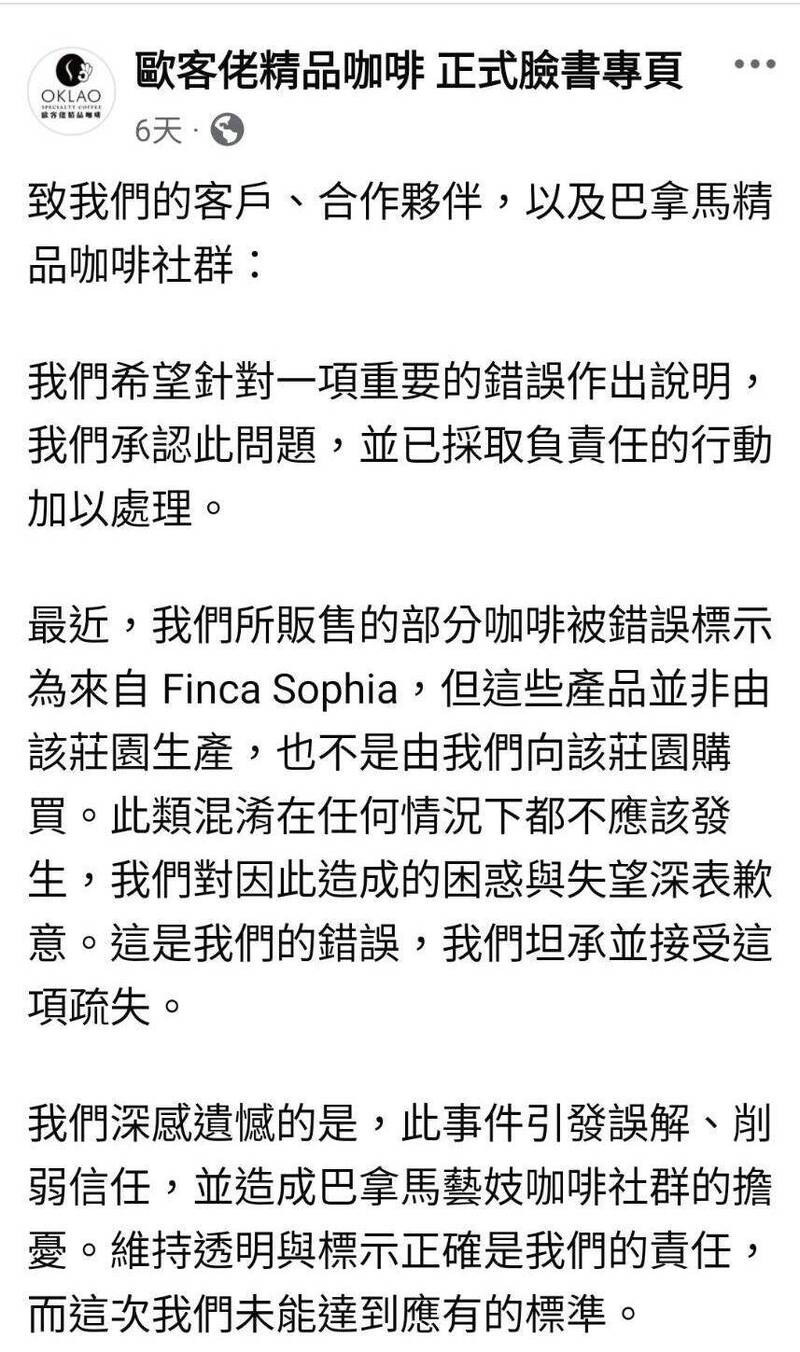 對於錯誤標示販售Finca Sophia的咖啡,歐客佬咖啡近日再度在臉書公開致歉。(擷取自歐客佬精品咖啡臉書)