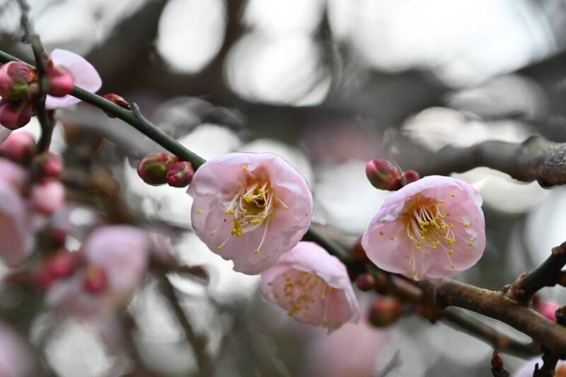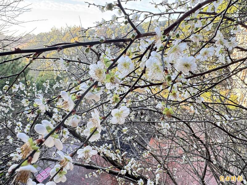 除了高山梅花悄悄綻放,較低海拔的豐原區流星花園幸福樂活園區種植的梅花也已盛開,只要一靠近就可聞到濃郁的梅花香,花期一樣約可持續至明年1月底。