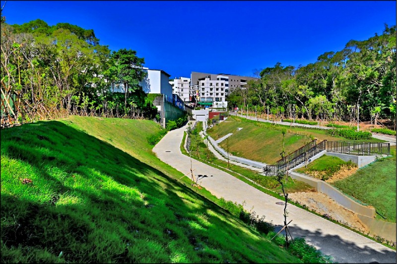 范世億表示,整個工程巧妙利用地形高低差,在東大及商圈污水出口處設礫間水質處理設施,以全重力流輸送水體方式,日處理污水量達一萬噸,讓經過處理污水可成為乾淨水流到下遊,而且還可發電,每日發電裝置容量一千二百W,供電給溪旁步道路燈。