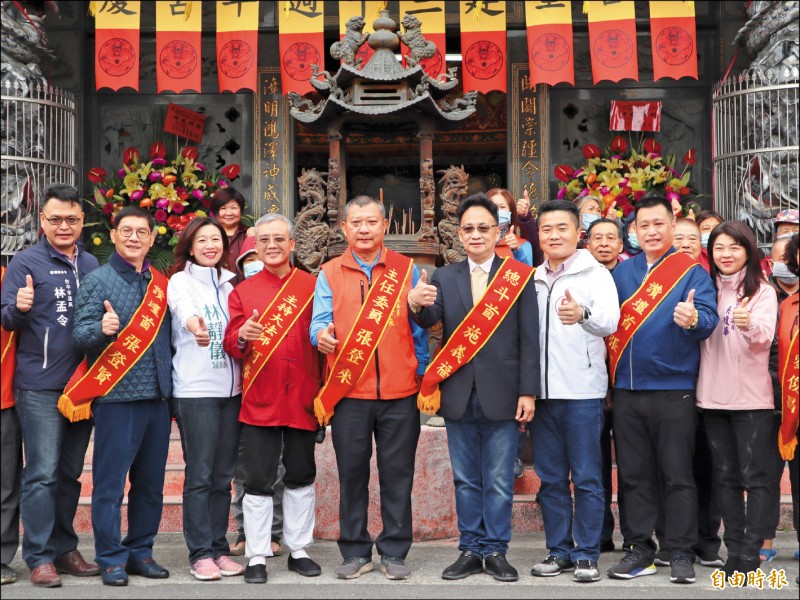 林靜儀(左三)及顏寬恒(右三)出席烏日建興宮建醮祈福法會團拜,並與廟方人員合照。(記者歐素美攝)