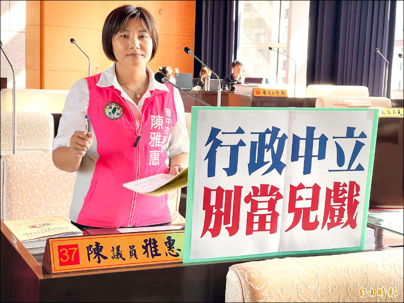 市議會昨進行行政中立專案報告,民進黨市議員陳雅惠指出,七日一場在台中國小活動中心舉辦的區里特色暨空氣污染防治宣導活動,主辦單位包括民政局長吳世瑋與東區、南區區長均在場下,現場竟播放「當選」歌曲,甚至還為出席的國民黨立委參選人羅廷瑋高喊「凍蒜」,瞬間變選舉造勢場,竟拿公共資源替特定參選人造勢,公然違反行政中立,令人傻眼。