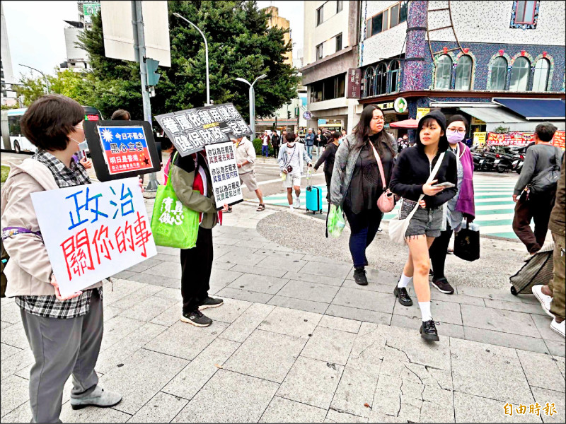 台中罷團把握清明連假,在台中火車站舉標語、設攤罷免連署。(記者蔡淑媛攝)