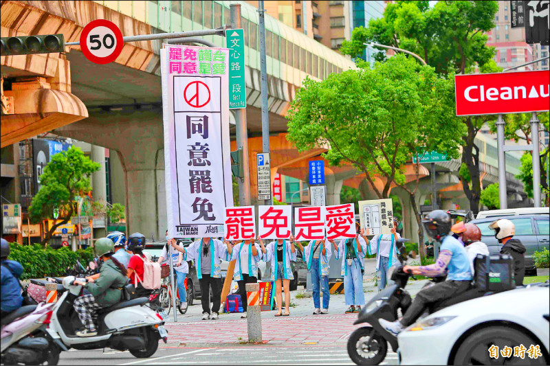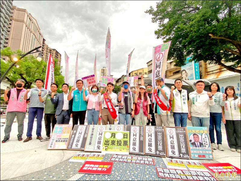 台中三藍委罷免成案,罷團高呼「出來投票、同意罷免」。(記者黃旭磊攝)