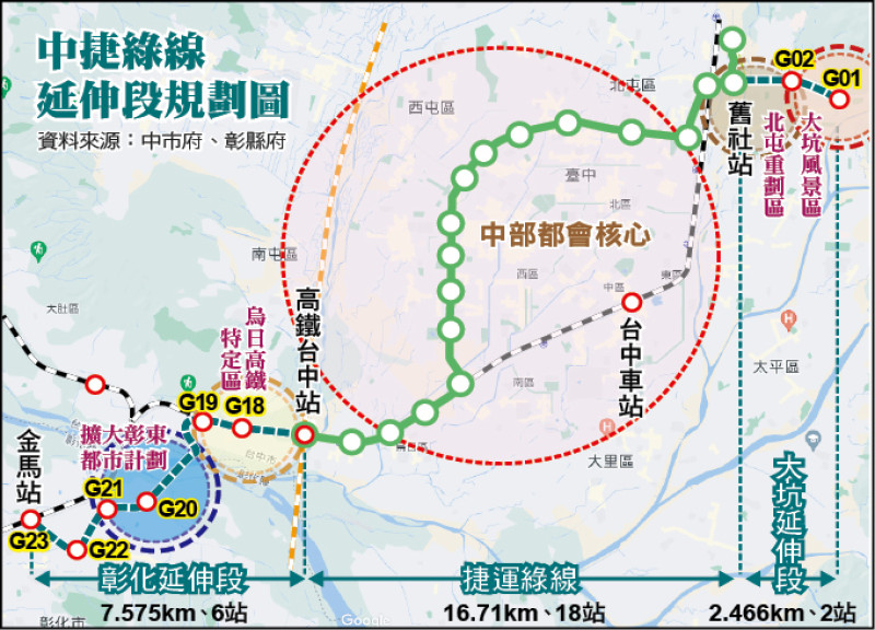 市府捷運工程局長蘇瑞文表示,綠線延伸線全線採高架型式,全長約十.〇四一公里,規劃設置八座車站。其中北向「大坑延伸段」自舊社站(G03)出發,跨越旱溪後延伸至大坑地區,長約二.四六六公里,增設二站;南向「彰化延伸段」則自高鐵台中站(G17)起,沿烏日高鐵特定區延伸至彰化市區,並銜接彰化鐵路高架化後新設的金馬站,全長約七.五七五公里,增設六站;後續完成核定到施工等階段後,整體建設期程預估約九年。