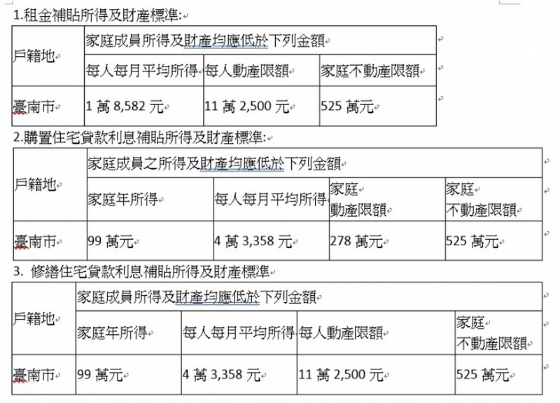南市租金補貼、購置住宅貸款利息補貼及修繕住宅貸款利息補貼所得及財產標準。(南市都發局提供)