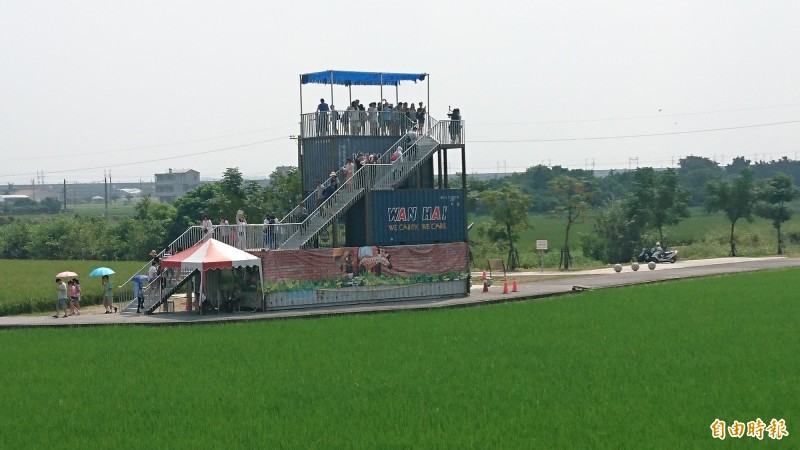 六甲區公所在彩繪稻田旁搭建三層樓高的觀景台供遊客登高眺望,大受歡迎。