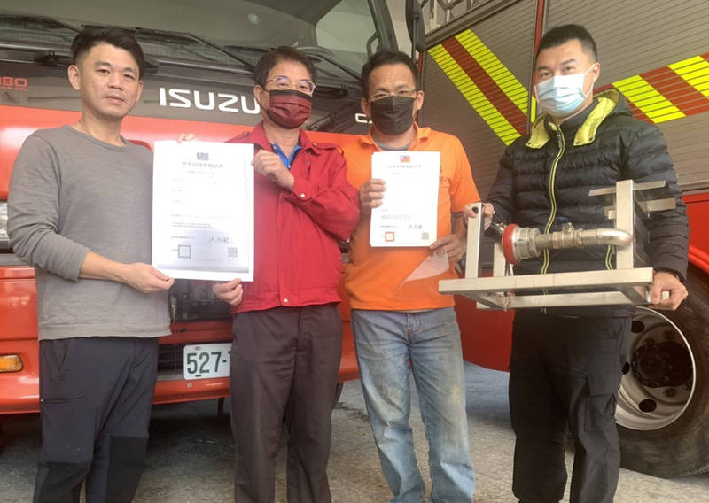 台南市消防局官田分隊小隊長陳至坤(右起)、義消幹事陳治華、隊員林建豪(左一)研發水帶清洗捲收機獲專利,第二大隊大隊長丁春能(左二)給予肯定。(分隊提供)