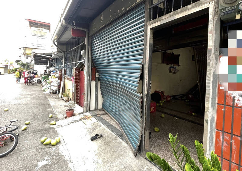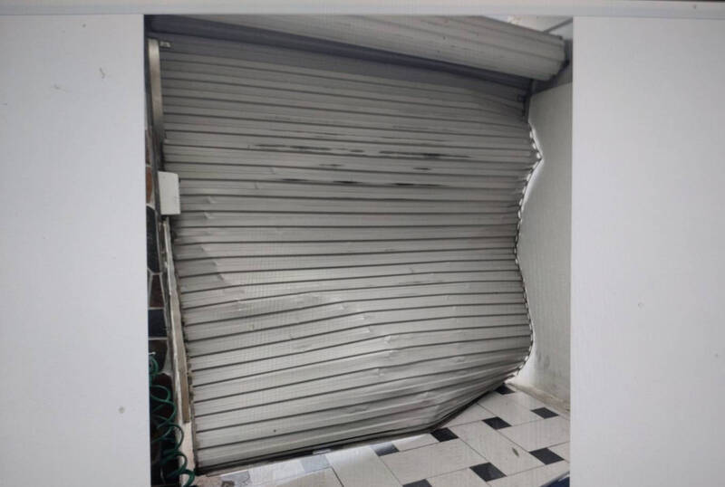 永康陳男家的鐵門被撞壞。(讀者提供)