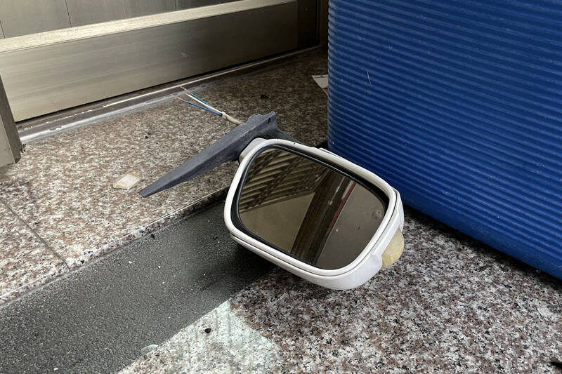 陳男涉嫌開車撞麻豆黃男住家鐵門後,留下撞掉的後視鏡。(警方提供)