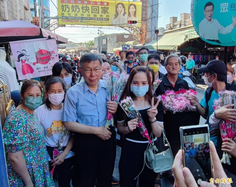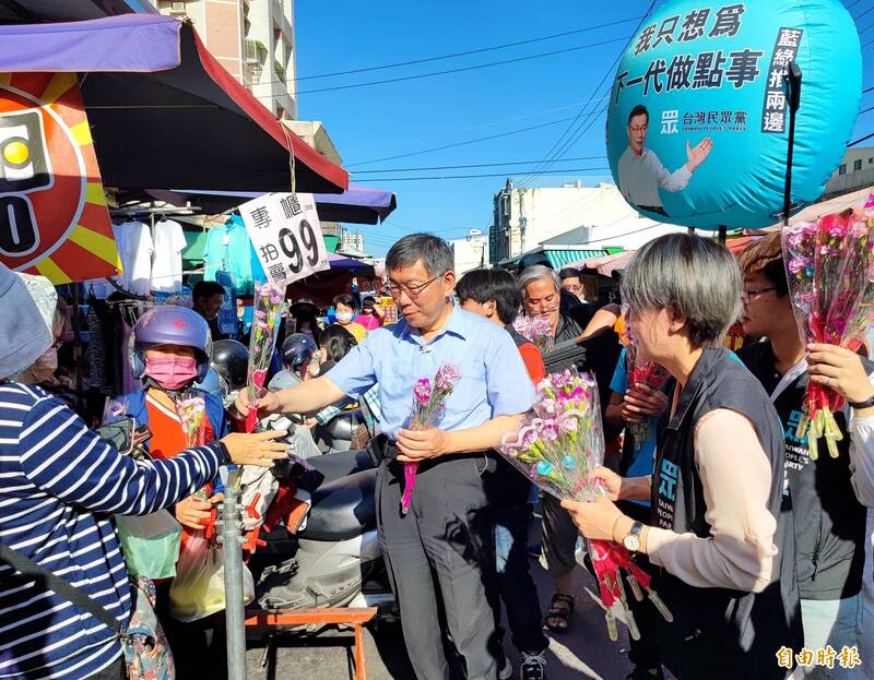 民眾黨主席柯文哲一早前往永康區的兵仔市掃街,發送康乃馨,也與鄉親們合影。(記者吳俊鋒攝)